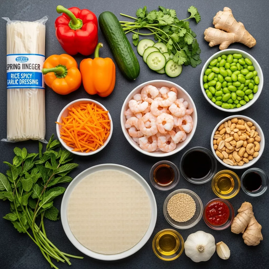 In a large bowl, combine the cooked rice noodles, sliced red bell pepper, sliced orange bell pepper, sliced cucumber, shredded carrots, cilantro, mint, edamame, and optional cooked shrimp or grilled chicken. The more colorful the veggies, the better!